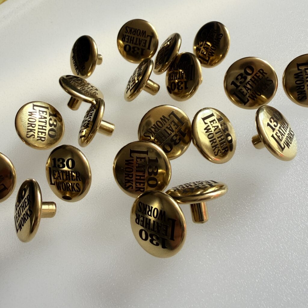 真鍮ならではの光沢と、ブラックで沈み込むロゴが良いコントラストを生み、革製品のアクセントとしても非常に映える仕上がりになりました。